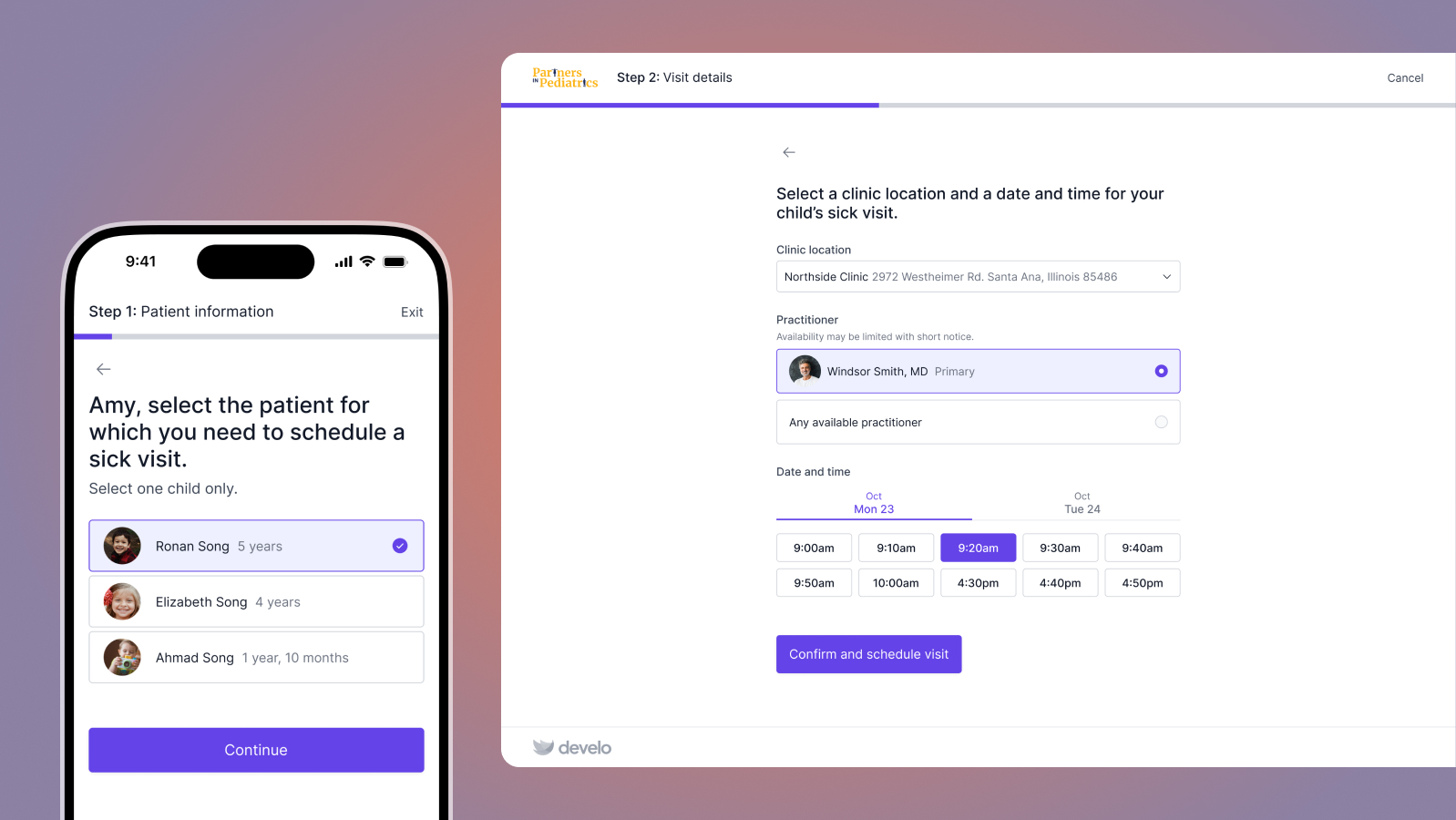 Practice-configured visit self-scheduling for both patients and parents.